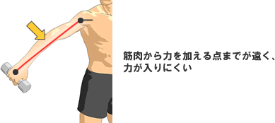 筋肉が骨にくっついている部分(付着部位)から、力がかかる点までの距離が遠ければ、強い力で動かすのは難しくなります。